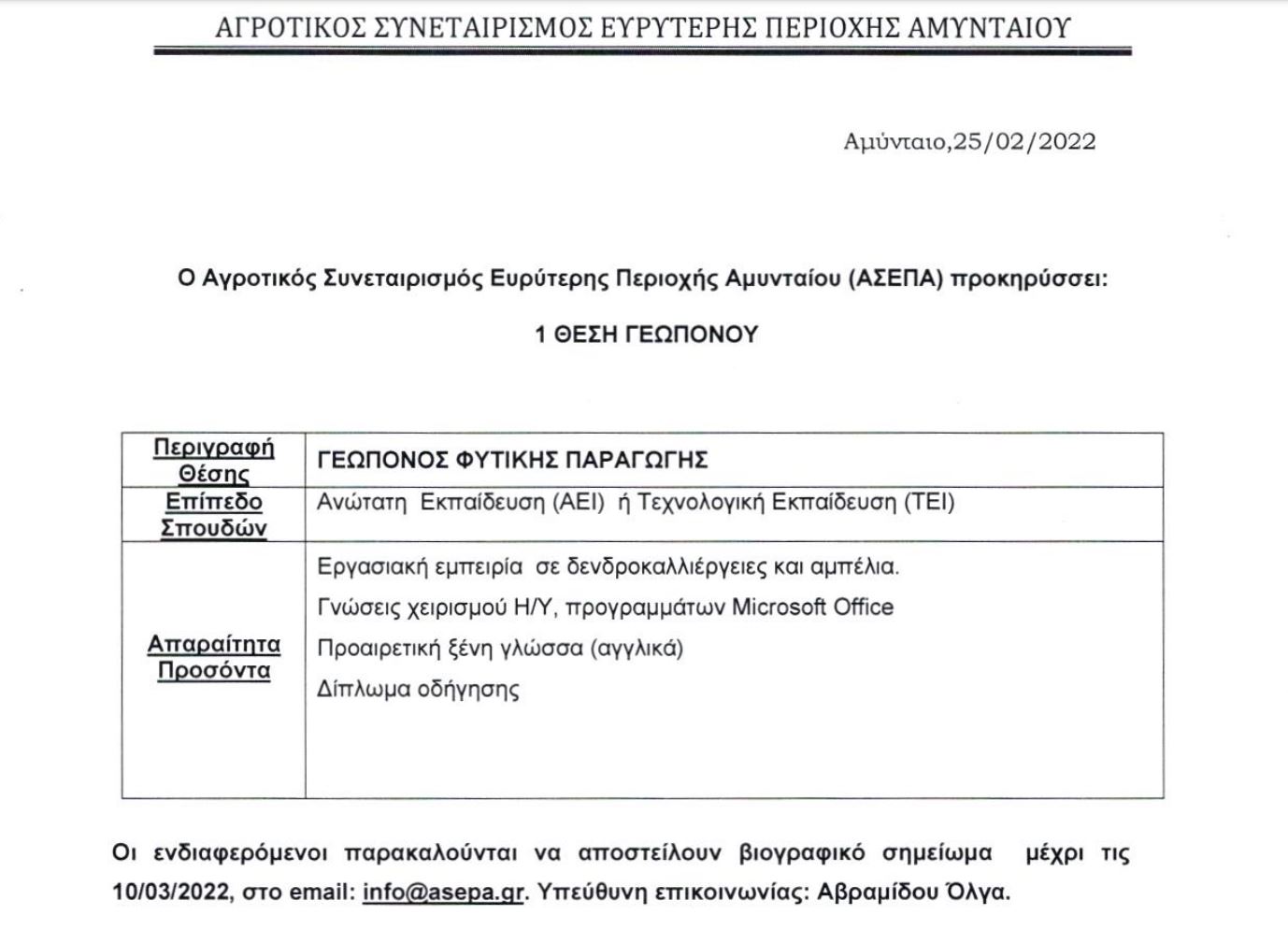 ΕΡΓΑΣΙΑ : Μία (1) θέση Γεωπόνου στον Αγροτικό Συνεταιρισμό Ευρύτερης Περιοχής Αμυνταίου,